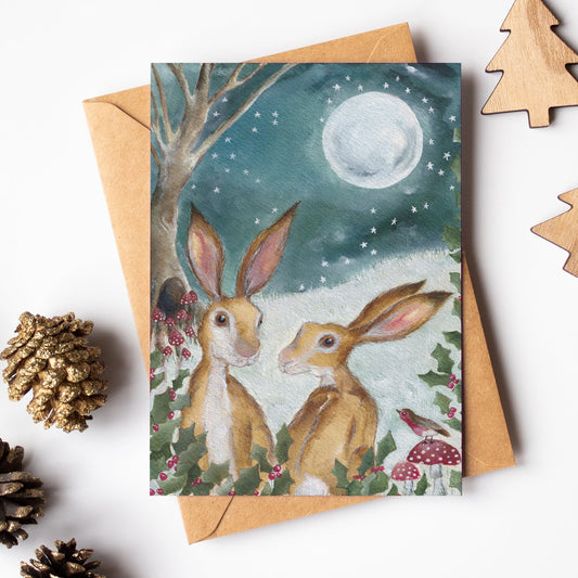 Holly Hares Card | Woodland Animal Festive Card | Hares Christmas Card