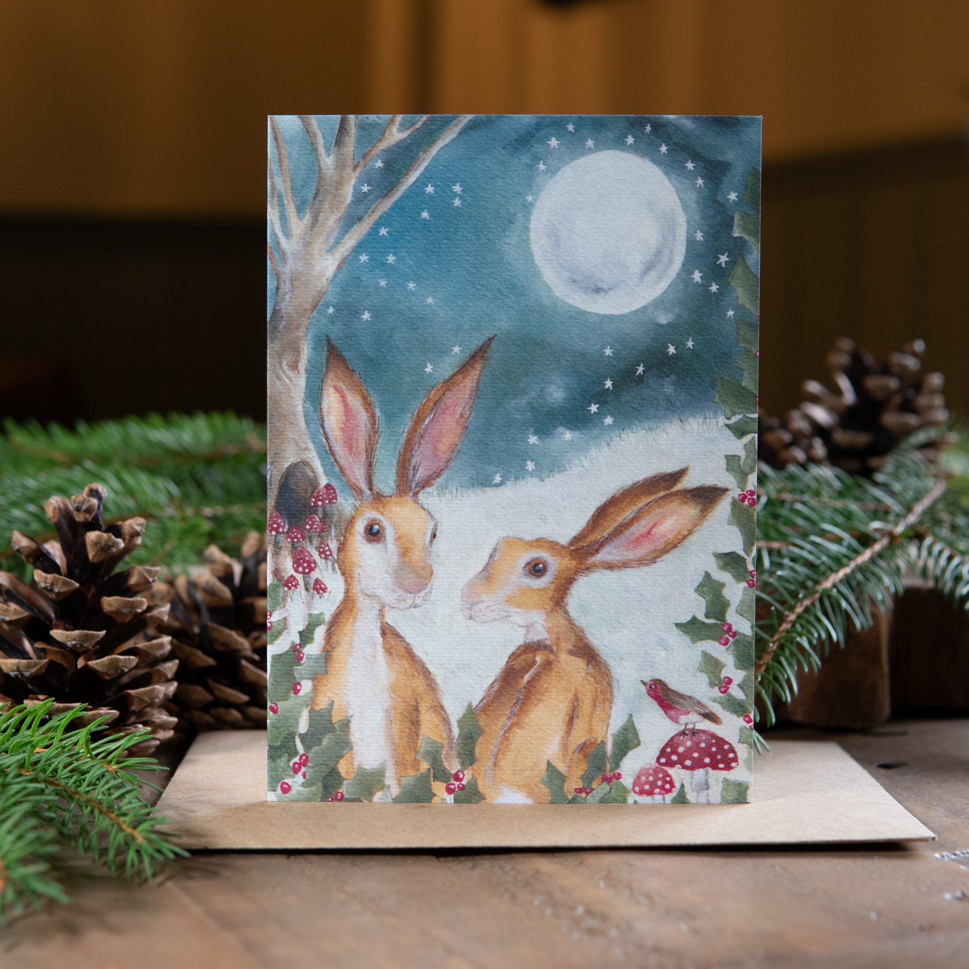 Holly Hares Card | Woodland Animal Festive Card | Hares Christmas Card